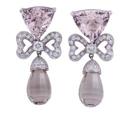 <span class='ref_item'>188 -</span> <span class="object_title">PENDIENTES EN ORO 18KT, DIAMANTES, KUNZITAS Y TOPACIOS</span>  <p><span class="technical_description">Pareja de pendientes realizados en oro de 18kt, con contrastes. Dos cuerpos con movimiento, con kunzitas en talla trillion fantasía, engastadas en garras, con un peso total aprox de 10.90ct, con detalle central de lazada con diamantes en talla brillante engastados en garras y grano, con un peso total aprox de 1.40ct, y dos topacios en talla briolette, con un peso total aprox de 30ct.<br/>Cierre: presión<br/>Longitud: 4cm</span><br>Peso: <span class="PESO_HCES1">18,70</span> <span class="PESOUMED_HCES1">gr.</span><br></p>