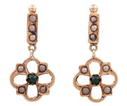 <span class='ref_item'>182 -</span> <span class="object_title">PENDIENTES EN ORO 18KT, ESMERALDAS Y PERLAS ALJÓFAR</span>  <p><span class="technical_description">Pareja de pendientes vintage realizados en oro de 18kt. Con esmeraldas centrales en talla redonda de peso total aprox 0.15ct y barra y aspas adornadas con pequeñas perlas aljófar en tonos grises<br/>Cierre: Ballestilla con ajuste por delante<br/>Longitud: 3,3cm</span><br>Peso: <span class="PESO_HCES1">2,90</span> <span class="PESOUMED_HCES1">gr.</span><br></p>