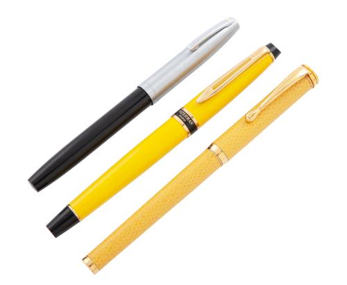 <span class='ref_item'>181 -</span> <span class="object_title">LOTE DE TRES PLUMAS ESTILOGRÁFICAS</span>   <p><span class="technical_description">- Pluma estilográfica WATERMAN con plumín dorado. Lacada en negro y amarillo. Carga por cartucho.<br/>- Pluma estilográfica LOEWE con plumín "Iridium Point". Recubierta de piel amarilla. Carga por cartucho.<br/>- Pluma estilográfica SHEAFFER recubierta en resina negra con carga por cartucho.</span><br><span class="PESO_HCES1">82 </span><span class="PESOUMED_HCES1">gr.</span><br></p>