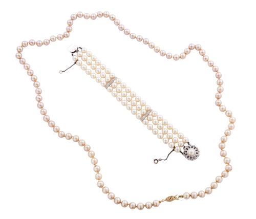 <span class='ref_item'>186 -</span> <span class="object_title">COLLAR Y PULSERA DE PERLAS</span>  <p><span class="technical_description">Lote formado por un collar largo de perlas calibras aprox en 8mm y una pulsera de 3 hilos de perlas calibras aprox en 8mm, con pasadores y broches adornados con circonitas. Broches y apliques de ambos en metal<br/>Cierre: Caja con lengüeta ambas y la pulsera con cadena de seguridad<br/>Medidas: 80cm el collar, 19cm la pulsera</span><br>Peso: <span class="PESO_HCES1">47,30</span> <span class="PESOUMED_HCES1">gr.</span><br></p>