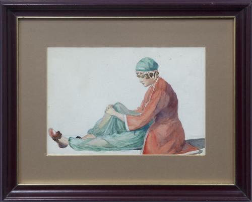 <span class='ref_item'>96 -</span> <span class="object_title">ODALISCA</span>   <p><span class="author">ESCUELA INGLESA, S.XIX-XX</span> <br><span class="technique_material">Acuarela y lápiz sobre papel</span><br><span class="technical_description">Mujer vestida de odalisca con traje rojo y azul, sentada en el suelo.<br/>Sellado en el papel "Made in England" en la parte inferior.<br/>Enmarcado en metacrilato con marco granate y paspartú.<br/>Medidas: 23 x 34cm sin marco</span><br></p>