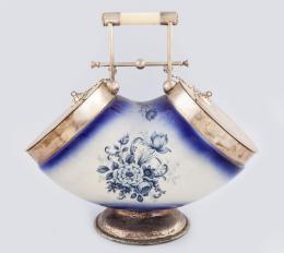<span class='ref_item'>117 -</span> <span class="object_title">GALLETERO INGLÉS EN CERÁMICA Y PLATA ESTERLINA S.XIX</span>   <p><span class="technique_material">Cerámica </span><br><span class="technical_description">Galletero con cuerpo realizado en cerámica vidriada en tono azul y blanco, decorada con motivos florales. <br/>Mecanismo superior de apertura manual por cadenas, con decoración de emblemas y flores grabada en ambas tapas. <br/>Punzón en la base. <br/>Medidas: 28x26,5</span><br></p>