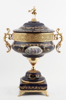 <span class='ref_item'>111 -</span> <span class="object_title">COPA DE GUSTO CLÁSICO EN LOZA ESMALTADA RONTONDO, ITALIA S.XX</span>   <p><span class="technique_material">Loza esmaltada y dorada</span><br><span class="technical_description">Con decoración floral en dorado sobre azul cobalto y escena galante en cartela. Destaca una montura calada, asas y remate superior de la tapa de metal dorado. <br/>Marca en la base.</span><br><span class="ALTO_HCES1">42 </span><span class="ALTOUMED_HCES1">cm.</span></p>