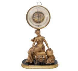 <span class='ref_item'>114 -</span> <span class="object_title">BARÓMETRO ESPAÑOL S. XIX</span>   <p><span class="technical_description">Barómetro realizado en calamina dorada. Con aparato medidor circular en la parte superior, que contiene dos termómetros (uno en grados Fahrenheit y otro en grados Reaumur) y barómetro aneroide indicador de la presión atmosférica, con mecanismo visible. Inscrito: "M.G. Aramburo - Óptico de S.M. - Calle del Príncipe Nº15 - Madrid". <br/>El aparato medidor se puede separar y tiene reasa para ser colgado. Apoyado sobre un resorte situado en una escultura femenina clásica, sentada y con elementos de sabiduría: compás, globo terráqueo con símbolos del horóscopo, catalejo y libros. Todo sobre peana de madera en negro y dorado.</span><br><span class="ALTO_HCES1">56</span>x<span class="ANCHO_HCES1">33</span>x<span class="GRUESO_HCES1">14 </span><span class="GRUESOUMED_HCES1">cm.</span></p>