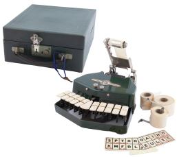 <span class='ref_item'>126 -</span> <span class="object_title">MÁQUINA ESTENOTIPIA, MARCA GRAND JEAN. AÑOS 50</span>   <p><span class="technical_description">Realizada en los años 50 por la marca Grand Jean en acero verde lacado con 21 teclas en hueso. Presenta su estuche original con asa y llave. Acompaña con tres rollos de papel para la impresión y guía de teclado. Con llave. Se encuentra en perfecto estado de uso.<br/>Herrajes oxidados. <br/>Medidas máquina: 23x20cm<br/>Medidas estuche: 25x12x23,5cm</span><br></p>