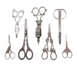 <span class='ref_item'>129 -</span> <span class="object_title">CONJUNTO DE 7 TIJERAS EN METAL DE DIFERENTES TIPOS, S.XIX</span>   <p><span class="technical_description">Tres tijeras de costura decoradas con motivos vegetales y animales.<br/>Una despabiladera en metal.<br/>Unas pinzas decoradas con motivos vegetales y rematadas en hojas.<br/>Dos tijeras de punta redonda. Una de ellas realizada en plata con contrastes alemanes ROSTFREI.</span><br><span class="PESO_HCES1">316,10 </span><span class="PESOUMED_HCES1">gr.</span><br></p>