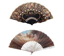 <span class='ref_item'>108 -</span> <span class="object_title">PAREJA DE ABANICOS DECORATIVOS</span>   <p><span class="technical_description">Varillaje en nácar con país en papel pintado a mano representando una escena de cortejo.<br/>Varillaje en madera decorada con motivos en dorado y país con escenas costumbristas, igualmente en papel. Varilla del extremo reajustada.<br/>Ambos con desperfectos.</span><br></p>