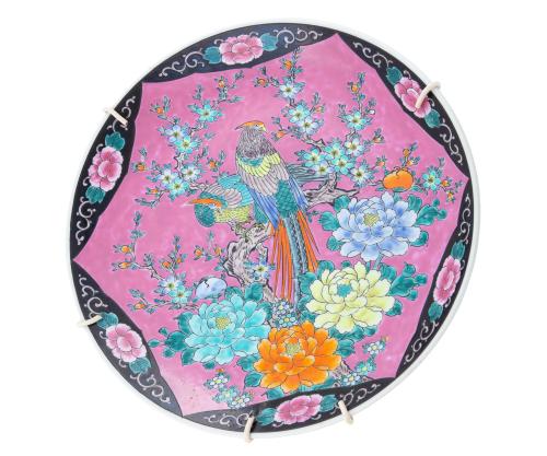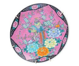 <span class='ref_item'>119 -</span> <span class="object_title">PLATO EN CERÁMICA ESTILO FAMILIA ROSA</span>   <p><span class="technique_material">Cerámica policromada</span><br><span class="technical_description">Sin sello. Representa motivos de aves y vegetales.<br/>Medidas: 38cm</span><br></p>