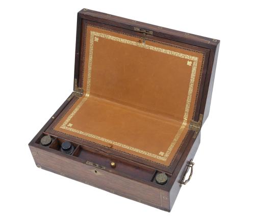 <span class='ref_item'>130 -</span> <span class="object_title">ESCRITORIO DE CAMPAÑA O VIAJE INGLÉS EN MADERA CON EMBUTIDOS EN LATÓN DORADO, S.XIX</span>   <p><span class="technical_description">Con agarradores laterales, uno de ellos es un cajón que se abre en el interior. Superficie de piel camel con filigrana dorada y compartimentos con tres tinteros en cristal y plumier y espacios interiores bajo la tabla. <br/>Faltas de aplicaciones en la tapa. Falta la llave. <br/>Medidas: 16x27x46cm</span><br></p>