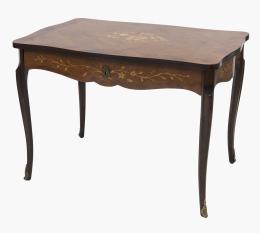 <span class='ref_item'>195 -</span> <span class="description">MESITA BAJA ESTILO LUIS XV </span>  <p><span class="description">Burbinga y palisandro.<br>Mesita baja estilo Luis XV con marquetería en la tapa de motivos florales, frente con cajón y decorado con guarniciones de bronce en patas y bocallave. <br>Con llave. <br>61 cm.x57 cm.x90 cm.</span></p>