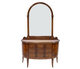 <span class='ref_item'>192 -</span> <span class="object_title">CONJUNTO MUEBLE APARADOR Y ESPEJO, ESTILO CLÁSICO</span>   <p><span class="technical_description">Mesa aparador estilo clásico en madera de nogal con tres cajones y decorado con marquetería.<br/>Con algunos desperfectos. <br/>Medidas: 118x79x32cm<br/>Espejo de pared en madera en forma de arco de medio punto. Con detalles tallados y marquetería. <br/>Medidas: 109x110cm</span><br></p>