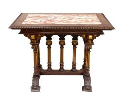 <span class='ref_item'>189 -</span> <span class="object_title">MESA  ALFONSINA EN MADERA DE NOGAL TALLADA</span>   <p><span class="technical_description">Con superficie de mármol rojo y policromía dorada. Decoración inferior formada por columnas de capitel jónico y pies con decoración vegetal. <br/>Mármol con faltas. Se aprecian restauraciones en la madera. <br/>Medidas: 77 x 103 x 67.2 cm. </span><br></p>