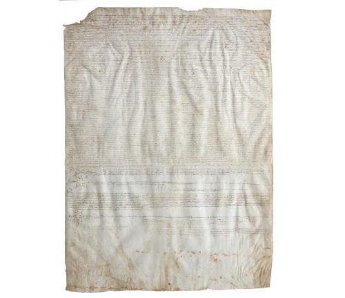 <span class='ref_item'>206 -</span> <span class="object_title">DOCUMENTO PÚBLICO DE COMPRAVENTA DE PROPIEDAD EN PIEL, ESCRITO EN CASTELLANO ANTIGUO (Villa de Borja, Zaragoza en marzo de 1664)</span>   <p><span class="technique_material">Piel</span><br><span class="technical_description">Escrito público notarial que documenta la venta de una heredad con casas, viñas y tierras y el precio establecido en moneda de la época. Poder firmado y fechado por escribano el Juan Pérez Torcal ante testigos como Juan Serra.<br/>Redactado en castellano antiguo con ilustraciones que representan dicha propiedad en la parte inferior izquierda. <br/>Medidas pergamino: 86,5x66,5cm.</span><br></p>