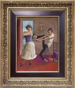 <span class='ref_item'>54 -</span> <span class="object_title">ESCENA MATRIMONIAL SATÍRICA</span>   <p><span class="author">FRANCISCO FERNÁNDEZ-DAZA "JANO" (Madrid, 1922-1992)</span> <br><span class="technique_material">Óleo sobre táblex</span><br><span class="technical_description">Firmado en el ángulo inferior derecho. <br/>Con marco de madera dorado. 53 x 44 cm<br/>Estimación de mercado: 170-180&euro;</span><br></p>