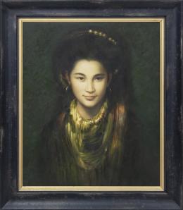 <span class='ref_item'>69 -</span> <span class="object_title">RETRATO DE MUJER, ESTILO ORIENTALISTA (S. XX)</span>   <p><span class="technique_material">Óleo sobre lienzo</span><br><span class="technical_description">Muestra el retrato de una mujer sobre un fondo negro, destacando el gran tocado de su cabello y las joyas que luce en su pecho.<br/>Sin firma.<br/>Enmarcado en madera con detalle dorado.<br/>Medidas marco: 75x64,5cm</span><br></p>