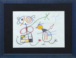 <span class='ref_item'>74 -</span> <span class="object_title">FIGURAS EN COLOR, 26/IV/82</span>   <p><span class="author">JOAN MIRÓ ( Barcelona,  1893- Mallorca, 1983)  </span> <br><span class="technique_material">Lápices de colores sobre papel</span><br><span class="technical_description">Representa dos figuras realizadas a lápices de colores destacando la composición en formas geométricas.<br/>Firmado y fechado por el autor a lápiz azul en zona derecha.<br/>Enmarcado en madera y cristal.<br/>Medidas: 33x43cm con marco</span><br></p>