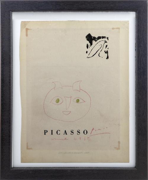 <span class='ref_item'>65 -</span> <span class="object_title">TÊTE DE FAUNO, 1945</span>   <p><span class="author">PABLO RUÍZ PICASSO (Málaga, 1881 - Mougins, 1973)  </span> <br><span class="technique_material">Lápiz de color sobre papel fino</span><br><span class="technical_description">Dibujo realizado en la página del libro de Ramón Gómez de la Serna "La completa y verídica historia de Picasso y el Cubismo", en cuyo reverso se conserva la fotografía del autor que acompaña el libro. Firmado y fechado 11-9-45.<br/>Libro publicado por la editorial Chiantore en 1945. <br/>Enmarcado en madera y cristal.<br/>Medidas hoja: 26 x 20cm<br/>Medidas marco: 33,5x27,5cm</span><br></p>