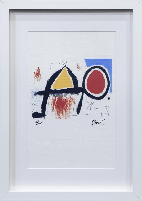 <span class='ref_item'>66 -</span> <span class="object_title">PERSONAJE DELANTE DEL SOL (1974)</span>   <p><span class="author">JOAN MIRÓ ( Barcelona,  1893- Mallorca, 1983)  </span> <br><span class="technique_material">Impresión a color sobre papel guarro firmado a mano por el autor</span><br><span class="technical_description">Representa la obra realizada por el autor, una figura geométrica de color amarillo ante un gran círculo rojo que protagoniza la obra.<br/>Firmada y numerada 12/100 a mano por el artista, según certificado adjunto.<br/>Enmarcado con metacrilato<br/>Acompaña certificado de autenticidad firmado y emitido por Royal Palace Gallery, con sello oficial, lacrado y en seco en dorado.<br/>Medidas con marco: 42x32cm</span><br></p>