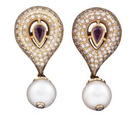 <span class='ref_item'>27 -</span> <span class="object_title">PENDIENTES EN PLATA DE LEY CHAPADOS EN ORO, ZAFIROS, PIEDRAS LUNA, DIAMANTES Y AMATISTAS</span>  <p><span class="technical_description">Pendientes largos con movimiento realizados en plata de ley chapada en oro rosa. Formados por zafiros dorados en talla fantasía con peso total aprox 0.75ct, piedras lunas en cabujón con peso total aprox 0.80ct y diamantes en talla brillante con peso total aprox 0.20ct. Rematan amatistas en talla briolette con peso total aprox 5ct<br/>Cierre: Presión<br/>Longitud: 5cm</span><br>Peso: <span class="PESO_HCES1">7,30</span> <span class="PESOUMED_HCES1">gr.</span><br></p>