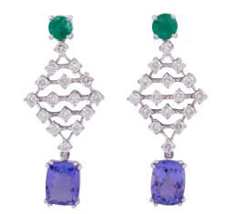 <span class='ref_item'>3 -</span> <span class="object_title">PENDIENTES EN ORO 18KT, ESMERALDAS, DIAMANTES Y TANZANITA</span>  <p><span class="technical_description">Pareja de pendientes largos con movimiento realizados en oro de 18kt. En parte superior esmeraldas en talla redonda con peso total aprox 0.80ct, seguidas de rombo formado por diamantes en talla brillante con un peso total aprox 1.70ct y en pendentif tanzanitas en talla cojín con peso total aprox 4ct.<br/>Cierre: Presión<br/>Longitud: 4cm</span><br>Peso: <span class="PESO_HCES1">10,20</span> <span class="PESOUMED_HCES1">gr.</span><br></p>