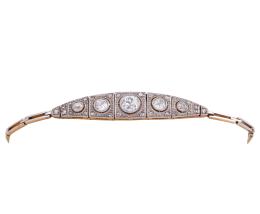 <span class='ref_item'>41 -</span> <span class="object_title">PULSERA EN ORO 16KT Y DIAMANTES</span>  <p><span class="technical_description">Pulsera de pedida antigua, realizada en oro de 16kt. Centro articulado con vistas en blanco, adornado por cuajado de diamantes y 5 diamantes mayores en talla brillante, el central con peso aprox 1.20ct, a sus laterales de 0.30.ct y al lado de estos de 0.10ct, <br/>Cierre: Caja con lengüeta, cadena y ocho de seguridad<br/>Longitud: 15cm</span><br>Peso: <span class="PESO_HCES1">9,50</span> <span class="PESOUMED_HCES1">gr.</span><br></p>