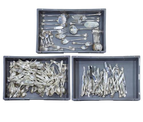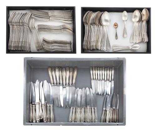 <span class='ref_item'>214 -</span> <span class="object_title">GRAN CUBERTERÍA EN PLATA DE LEY </span>  <p><span class="technical_description">Gran cubertería realizada en plata de ley repujada en mangos, decorada con motivos vegetales. Con contrastes en el reverso de cada pieza.<br/>Formada por 346 piezas en total<br/>Peso sin cuchillos: 11,94kg<br/>Peso de cuchillos: 4,56kg</span><br></p>