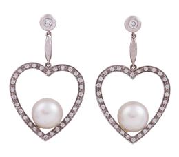 <span class='ref_item'>118 -</span> <span class="object_title">PENDIENTES EN ORO 18KT, PERLAS CULTIVADAS AUSTRALIANAS Y DIAMANTES</span>  <p><span class="technical_description">Pareja de pendientes, largos con movimiento, realizados en oro de 18kt. Con forma de corazón adornados en su parte inferior por grandes perlas cultivadas australianas calibradas aprox en 13,3mm. En la silueta del corazón y en botones superiores diamantes en talla brillante con peso total aprox 1ct (0.20ct cada uno de los diamantes de los botones)<br/>Cierre: Presión<br/>Longitud: 5,50cm</span><br>Peso: <span class="PESO_HCES1">27,50</span> <span class="PESOUMED_HCES1">gr.</span><br></p>