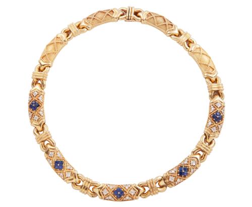 <span class='ref_item'>151 -</span> <span class="object_title">GARGANTILLA "YANES" EN ORO 18KT, ZAFIROS Y DIAMANTES</span>  <p><span class="technical_description">Gargantilla de la joyería "Yanes", colección Malpica, realizada en oro de 18kt. En cinco eslabones, centro de zafiros en talla carré con peso total aprox 3ct, acompañados de diamantes en talla brillante con peso total aprox 3.50ct. Además, cuatro eslabones mates. Nº 10005<br/>Cierre: Caja con lengüeta y ocho de seguridad<br/>Longitud: 45cm</span><br>Peso: <span class="PESO_HCES1">153</span> <span class="PESOUMED_HCES1">gr.</span><br></p>