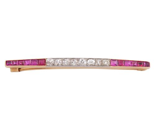 <span class='ref_item'>157 -</span> <span class="object_title">ALFILER EN ORO 18KT, RUBÍES Y DIAMANTES</span>  <p><span class="technical_description">Alfiler realizado en oro de 18kt. Adornado por rubíes en talla galería con peso total aprox 0.60ct y diamantes en talla roca con peso total aprox 0.80ct<br/>Cierre: Aguja<br/>Longitud: 5,5cm</span><br>Peso: <span class="PESO_HCES1">5,20</span> <span class="PESOUMED_HCES1">gr.</span><br></p>