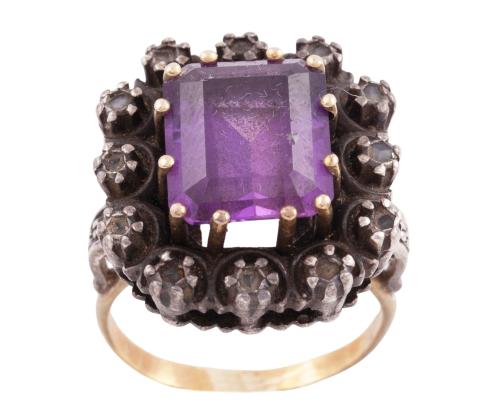 <span class='ref_item'>156 -</span> <span class="object_title">SORTIJA EN PLATA CHAPADA ORO, AMATISTA Y DIAMANTES</span>  <p><span class="technical_description">Sortija realizada en plata con partes chapadas en oro. Amatista central en talla esmeralda con peso total aprox 4ct y orla de diamantes en talla rosa con peso aprox 0.20ct<br/>Medida Sortija: 11</span><br>Peso: <span class="PESO_HCES1">10,60</span> <span class="PESOUMED_HCES1">gr.</span><br></p>
