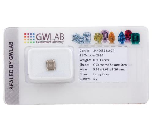 <span class='ref_item'>168 -</span> <span class="object_title">DIAMANTE EN TALLA ESMERALDA DE 0.95CT</span>  <p><span class="technical_description">Diamante en talla esmeralda de 0.95ct<br/>Color: fancy (AA) gray<br/>Pureza: SI2<br/>Acompaña certificado de GWLAb nº244005531024 con las características de la piedra.</span><br></p>