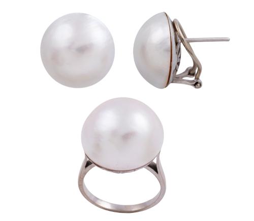<span class='ref_item'>177 -</span> <span class="object_title">CONJUNTO DE SORTIJA Y PENDIENTES EN ORO 18KT CON PERLAS MABE</span>  <p><span class="technical_description">Conjunto formado por una sortija y par de pendientes realizados en oro de 18kt. Adornados por perlas mabe, calibradas aprox en 15-17mm<br/>Medida Sortija: 14<br/>Cierre Pendientes: Omega </span><br>Peso: <span class="PESO_HCES1">16</span> <span class="PESOUMED_HCES1">gr.</span><br></p>
