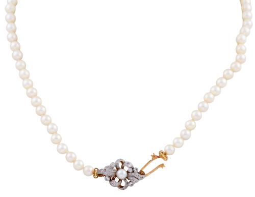 <span class='ref_item'>183 -</span> <span class="object_title">COLLAR DE PERLAS CULTIVADAS Y BROCHE EN ORO 18KT Y ZAFIROS BLANCOS</span>  <p><span class="technical_description">Collar de perlas cultivadas en color blanco calibradas aprox en 6mm. Broche realizado en oro 18kt, con vistas en plata adornado por zafiros blancos (falta un zafiro)<br/>Cierre: Gancho<br/>Longitud: 50cm</span><br>Peso: <span class="PESO_HCES1">27,80</span> <span class="PESOUMED_HCES1">gr.</span><br></p>