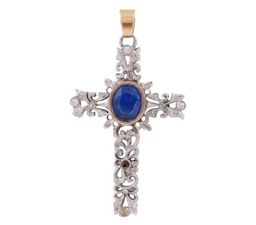 <span class='ref_item'>176 -</span> <span class="object_title">COLGANTE CRUZ EN PLATA 800, ORO 18KT, ZAFIRO AZUL SÍNTETICO Y ZAFIROS BLANCOS</span>  <p><span class="technical_description">Colgante en forma de cruz latina realizado en plata 800 con parte trasera chapada en oro. Diseño calado con zafiro azul sintético en talla oval y adorno de 4 zafiros blancos (faltaría otro). Asa grande para colgar realizada en oro 18kt<br/>Medidas: 5 x 3cm</span><br>Peso: <span class="PESO_HCES1">6,50</span> <span class="PESOUMED_HCES1">gr.</span><br></p>