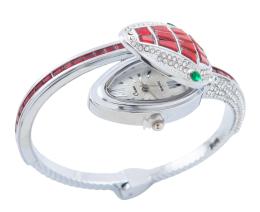 <span class='ref_item'>16 -</span> <span class="object_title">RELOJ DE PULSERA EN METAL PLATEADO, CRISTALES ROJOS, VERDES E INCOLOROS. CUARZO</span>  <p><span class="technical_description">Reloj de pulsera en metal plateado de la marca Cussi, con movimiento de cuarzo. Con forma de serpiente cuajada por cristales rojos en tallas baguette y trapecio, cristales verdes talla marquise y cristales incoloros en talla brillante. Debajo de la cabeza de la serpiente se encuentra la esfera del reloj. Brazalete abierto semirígido. En estado de marcha.<br/>Diámetro: 7cm</span><br>Peso: <span class="PESO_HCES1">47</span> <span class="PESOUMED_HCES1">gr.</span><br></p>