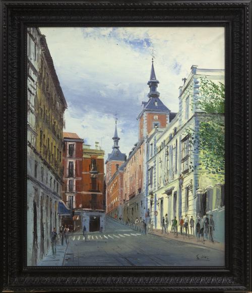 <span class='ref_item'>33 -</span> <span class="object_title">CALLE MAYOR, MADRID</span>   <p><span class="author">SANTIAGO DÍAZ SANTOS (Madrid, 1940)</span> <br><span class="technique_material">Óleo sobre lienzo</span><br><span class="technical_description">Firmado en el ángulo inferior izquierdo.<br/>Enmarcado<br/>Medidas: 88 x 75cm con marco. 73 x 60cm sin marco</span><br></p>