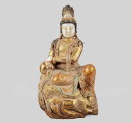 <span class='ref_item'>231 -</span> <span class="object_title">GUANYIN DE LUNA Y AGUA TALLADA EN JADE BLANCO, POLICROMADO Y BAÑO DE ORO. CHINA, DINASTÍA QING, FFS. S. XVIII.</span>   <p><span class="technical_description">En la cultura china esta figura, está ligada a la simbología de la felicidad.<br/>La principal característica de esta Guanyin, es que se aleja de su representación tradicional de pie, y se representa sedente con postura conocida como "Ruyi", es decir, con la pierna derecha apoyada sobre una roca y el pie izquierdo en posición vertical.</span><br><span class="ALTO_HCES1">50 </span><span class="ALTOUMED_HCES1">cm.</span>x<span class="ANCHO_HCES1">28 </span><span class="ANCHOUMED_HCES1">cm.</span>x<span class="GRUESO_HCES1">21 </span><span class="GRUESOUMED_HCES1">cm.</span></p>