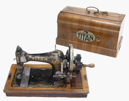 <span class='ref_item'>225 -</span> <span class="object_title">MÁQUINA DE COSER WINSELMANN TITAN</span>   <p><span class="technique_material">Metal y madera </span><br><span class="technical_description">Máquina de coser Winselmann Titan en metal lacado y decoración dorada. <br/>En su estuche de madera original. Faltas en la máquina y el estuche por el paso del tiempo, y grietas en el estuche.<br/>Con llave. En funcionamiento.</span><br></p>