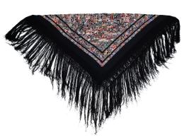 <span class='ref_item'>220 -</span> <span class="object_title">MANTON DE MANILA  BORDADO SOBRE SEDA NEGRA CON MOTIVOS CHINESCOS EN MULTICOLOR</span>   <p><span class="technical_description">Mantón de Manila bordado sobre seda negra, estilo cantonés con intrincados bordados con hilos de seda de motivos chinescos en multicolor, incluyendo detalles de pagodas, puentes, carrozas y diversas figuras humanas y animales.<br/>Rejilla y flecos largos , también en negro. Muy elegante.<br/>Medidas : 1,60 cm x 1,60 cm sin flecos. Rejilla y fleco 65 cm </span><br></p>