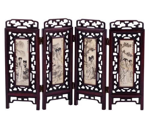 <span class='ref_item'>218 -</span> <span class="object_title">BIOMBO CHINO EN MINIATURA DE 4 HOJAS CON PLACAS DE HUESO PIROGRABADAS POR AMBAS CARAS y MADERA TALLADA CON MOTIVOS GEOMETRICO, FF. S.XIX</span>  <p><span class="technical_description">Por una cara se representan escenas de figuras femeninas, y al otro escenas con un personaje masculino.<br/>Medidas abierto: 23 x 36 x 1cm.<br/>Medidas cerrado: 23 x 8.5 x 4cm.</span><br></p>