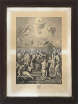<span class='ref_item'>46 -</span> <span class="description">TRANSFIGURACIÓN DE CRISTO SEGUN RAFAEL </span>  <p><span class="description">RAPHAEL MORGHEN (Italia, 1758-1833) Grabado sobre papel Realizado a buril Medidas de la mancha: 72 x 49 cm Firmado a tinta en el ángulo inferior derecho y sello seco en el mismo ángulo con las iniciales R. M. Enmarcado con marco de madera ebonizada del siglo XIX y con cristal  </span></p>