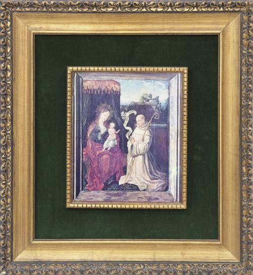 <span class='ref_item'>44 -</span> <span class="description">"LACTACIÓN DE SAN BERNARDO" IMPRESIÓN A COLOR DE LA TABLA CENTRAL </span>  <p><span class="description">Impresión a color Impresión a color barnizada de fotografías tomadas a las escenas del retablo de la Lactación de san Bernardo, santa Clara de Asís y san Francisco de Asís. Representa la tabla central. Enmarcada en madera trabajada en dorado y tallada con paspartú de terciopelo verde oscuro. Medidas con marco: 63 x 58,5 cm</span></p>