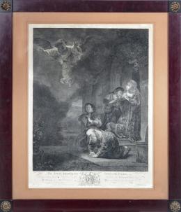 <span class='ref_item'>92 -</span> <span class="object_title">LA APARICIÓN DEL ÁNGEL A TOBIT Y SU FAMILIA. LONDRES, 1765.</span>   <p><span class="technique_material">Grabado</span><br><span class="technical_description">Perteneciente a la producción de Anthony Walker (Thirsk, 1726 - Londres, 1765), grabador inglés. Se trata de un grabado copia de la obra original de Rembrandt. <br/>En la parte inferior se lee: " The Angel departing from Tobit & his family. From a picture painted by Reembrandt in the Collection  of Nathaniel Hone, Esq. To whom this plate is dedicated by his much obliged and most humble servant". <br/>Enmarcado con cristal<br/>Medidas: 66 x 56cm con marco. 52 x 39cm sin marco</span><br></p>