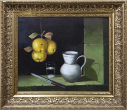 <span class='ref_item'>90 -</span> <span class="description">BODEGÓN CON MEMBRILLOS </span>  <p><span class="description">ESCUELA ESPAÑOLA S.XIX Óleo sobre lienzo Bodegón de membrillos, recipientes y cuchillo, sobre una repisa con fondo oscuro. Firmado en la esquina inferior derecha F. MASAS Enmarcado en madera dorada y tallada con elementos vegetales. Medidas con marco: 64,5 x 73,5cm</span></p>