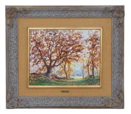 <span class='ref_item'>86 -</span> <span class="object_title">"PAISAJE OTOÑAL CON PAREJA"</span>   <p><span class="author">JOAQUIM MARSILLACH CODONY</span> <br><span class="technique_material">Oleo sobre tablex</span><br><span class="technical_description">Paisaje representando un paisaje otoñal con pareja de personas bajo gran árbol <br/>Con importante marco de madera tallada en tonos grises y dorados y bisel dorado, con paspartú entre marco y bisel<br/>Y placa metálica con nombre de autor en parte inferior<br/>Medidas con marco: 69 X 77 cm</span><br></p>
