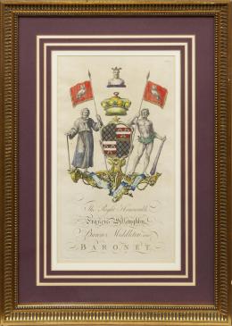 <span class='ref_item'>115 -</span> <span class="description">ESCUDOS NOBILIARIOS DE FRANCIS WILLOUGHBY </span>  <p><span class="description">ESCUELA INGLESA S.XIX Grabado iluminado Francis Willoughby, Barón de Middleton, numerado 408 en el ángulo superior derecho. Con marco de madera y cristal Medidas: 43,5 x 25cm el papel. 67,5 x 49cm con marco</span></p>