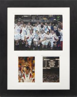 <span class='ref_item'>111 -</span> <span class="description">FOTO CONMEMORATIVA DEL PARTIDO DE RUGBY AUSTRALIA-INGLATERRA. </span>  <p><span class="description">Fotografía Final de la Copa Mundial de Rugby de 2003. Firmada por los jugadores del equipo inglés. Enmarcado con metacrilato. Medidas: 80 x 64cm con marco</span></p>