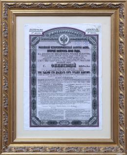<span class='ref_item'>125 -</span> <span class="description">CERTIFICADO DE ACCIONES RUSO ÉPOCA ZARISTA, 1899 </span>  <p><span class="description">Papel<br>Certificado de acciones con número 688726, firmado y fechado en 1899. Con sellos rusos en la esquina superior derecha. Decorada con gran cenefa en negro y violeta con el escudo del Zar en la zona superior.<br>Enmarco en madera trabajada en dorado y cristal. <br>Medidas: 62 x 50 cm marco incluido.</span></p>