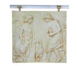 <span class='ref_item'>108 -</span> <span class="description">PLACA DECORATIVA EN MARMOLINA "OFRENDA" </span>  <p><span class="description">Decorada con escena en altorrelieve en el que se muestran un par de figuras femeninas acompañadas por un pavo real, atributo de la diosa Venus. Muestra algunas faltas. Con aplicación de metacrilato superior. Medidas: 43x46cm</span></p>