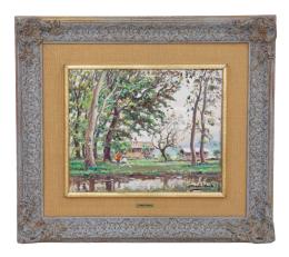 <span class='ref_item'>114 -</span> <span class="object_title">"PAISAJE DE ARBOLES PRIMAVERAL CON PAREJA CERCA DE LAGUNA"</span>   <p><span class="author">JOAQUIM MARSILLACH CODONY</span> <br><span class="technique_material">Oleo sobre tablex</span><br><span class="technical_description">Paisaje representando arboleda en primavera con pareja cerca de laguna<br/>Con importante marco de madera tallada en tonos grises y dorados y bisel dorado, con paspartú entre marco y bisel<br/>Y placa metálica con nombre de autor en parte inferior<br/>Medidas con marco: 69 X 77 cm</span><br></p>